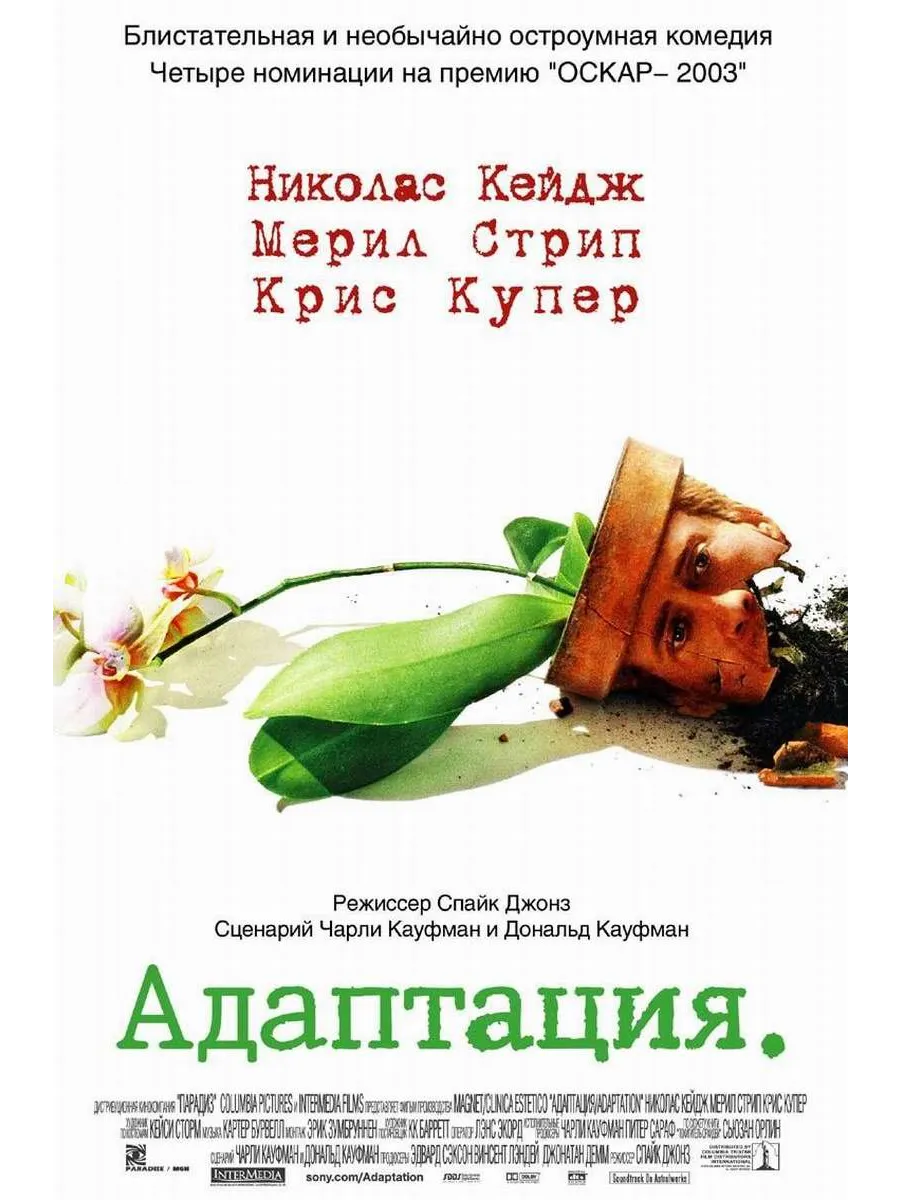 Взявшись за адаптацию книги журналистки Сьюзен Орлеан «Похититель орхидей», знаменитый сценарист Чарли Кауфман оказывается в душевном и творческом тупике. Странные чувства, овладевшие им, мешают ему работать. Но однажды Чарли решает описать в сценарии всё происходящее с ним. Вскоре автор замечает, что действительность и вымысел начинают переплетаться самым причудливым и неожиданным образом.