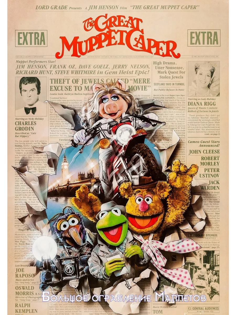 Кермит и Фоззи оказываются близнецами, которых все путают (тем, кто помнит, кто это такие, уже должно быть смешно). Они устраиваются на работу в газету где-то в США и сразу получают опасное задание: расследовать похищение драгоценностей у королевы моды леди Холлидей. Для этого отважные репортёры едут в Лондон, где объединяются с коммуной маппетов. Злодеи же, три красотки-манекенщицы и брат леди Холлидей, Ники (табличка на двери его кабинета сообщает «Ники — безответственный паразит»), не дремлют. Их план — похитить огромный бриллиант, но прежде надо отвести от себя подозрения и подставить секретаршу леди Холлидей, мисс Пигги, как воровку. Только маппетам по силам остановить преступников…