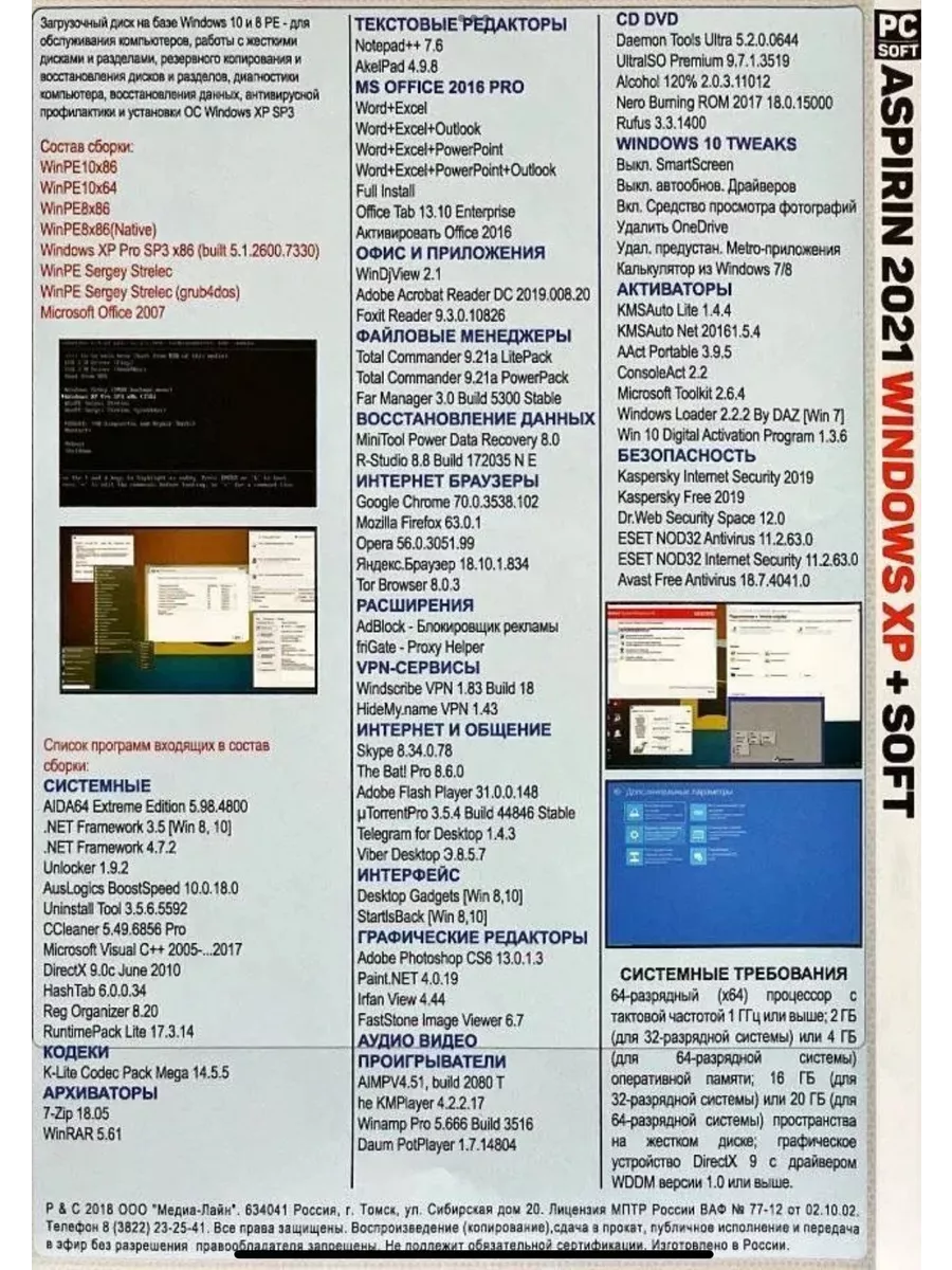DVD диск ASPIRIN 2021 представляет собой комплексное программное решение, предназначенное для пользователей Windows XP, Windows PE и WPI Soft. Этот диск содержит набор инструментов и приложений, которые значительно упрощают работу с операционными системами и обеспечивают их эффективное управление. ASPIRIN 2021 включает в себя утилиты для диагностики, восстановления системы, оптимизации производительности и защиты данных, что делает его незаменимым инструментом для любого пользователя ПК. Благодаря удобному интерфейсу и широкому спектру функций, диск ASPIRIN 2021 поможет повысить надежность и безопасность вашего компьютера, а также улучшить его общую производительность.