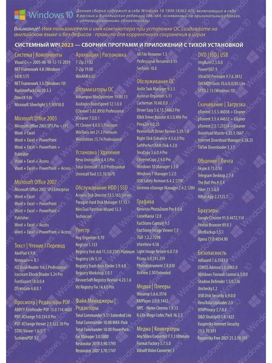 DVD диск Мега Софт 2023 (Windows 10 + WPI Soft) V1 представляет собой комплексное программное обеспечение, предназначенное для установки на ноутбуки и компьютеры. Этот диск содержит последнюю версию операционной системы Windows 10, которая обеспечивает высокую производительность, удобство использования и широкий спектр функций для работы, обучения и развлечений. В комплект также входит WPI Soft, инструмент для оптимизации и настройки системы, который позволяет пользователям настроить свою операционную систему под свои нужды, улучшить её работу и безопасность. DVD диск Мега Софт 2023 является идеальным выбором для тех, кто хочет получить полноценную и настроенную под себя операционную систему Windows 10, а также для тех, кто ценит удобство и эффективность работы с компьютером.