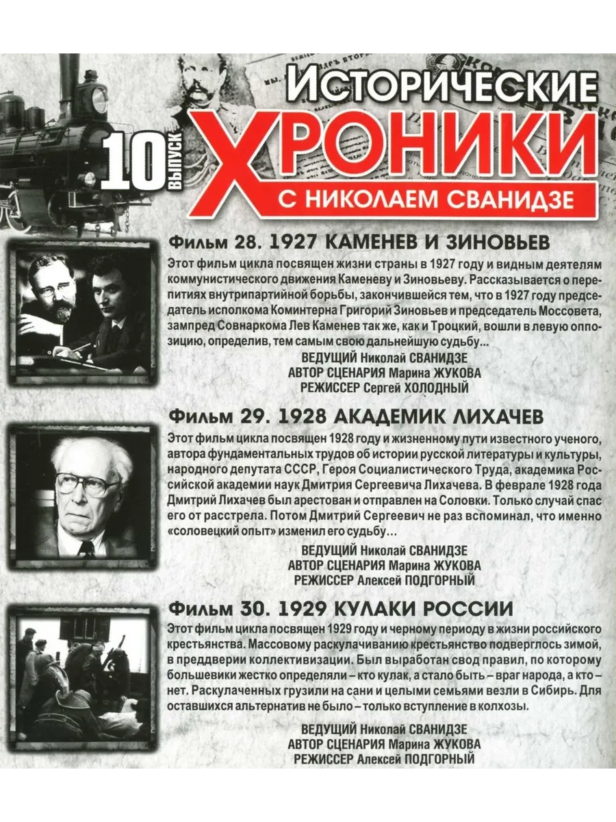 Фильм 28. 1927 - Каменев И ЗиновьевЭтот фильм цикла посвящен жизни страны в 1927 году и видным деятелям коммунистического движения Каменеву и Зиновьеву. Рассказывается о перепитиях внутрипартийной борьбы, закончившейся тем, что в 1927 году председатель исполкома Коминтерна Григорий Зиновьев и председатель Моссовета, зампред Совнаркома Лев Каменев так же, как и Троцкий, вошли в левую оппозицию, определив, тем самым свою дальнейшую судьбу...