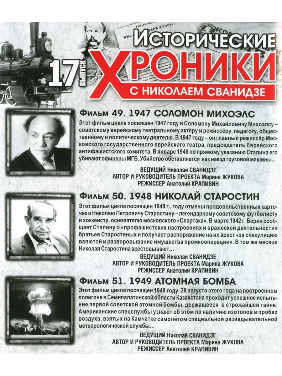 Фильм 49: 1947. Соломон МихоэлсЭтот фильм цикла посвящен 1947 году и Соломону Михайловичу Михоэлсу - советскому еврейскому театральному актеру и режиссеру, педагогу, общественному и политическому деятелю. В1947 году - он главный режиссер Московского государственного еврейского театра, председатель Еврейского антифашистского комитета. В январе 1948 по прямому указанию Сталина его убивают офицеры МГБ. Убийство обставляется как наезд грузовой машины...
