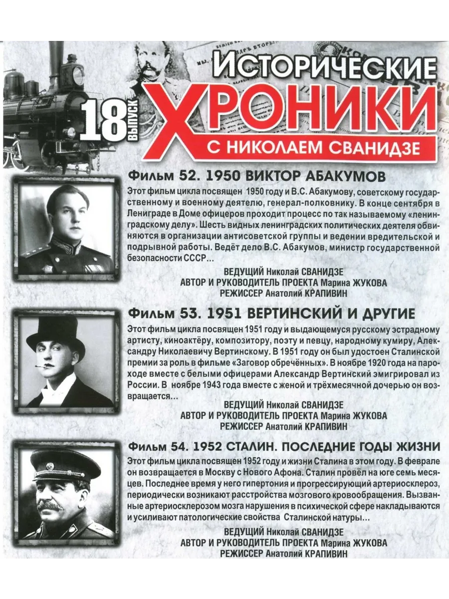Фильм 54: 1952. Сталин. Последние годы жизниЭтот фильм цикла посвящен 1952 году и жизни Сталина в этом году. В феврале он возвращается в Москву с Нового Афона. Сталин провел на юге семь месяцев. Последнее время у него гипертония и прогрессирующий артериосклероз, периодически возникают расстройства мозгового кровообращения. Вызванные артериосклерозом мозга нарушения в психической сфере накладываются и усиливают патологические свойства Сталинской натуры...