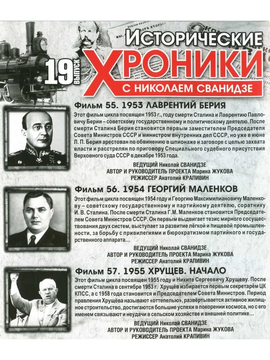 Фильм 57: 1955. Хрущев. НачалоЭтот фильм цикла посвящен 1955 году и Никите Сергеевичу Хрущеву. После смерти Сталина в сентябре 1953 г. Хрущев избирается первым секретарем ЦК КПСС, а с 1958 года становится и Председателем Совета Министров. Период правления Хрущева называют "оттепелью", развертывается активное жилищное строительство, достигаются большие успехи в покорении космоса, но с его именем связывают и неудачи в сельском хозяйстве и внешней политике...
