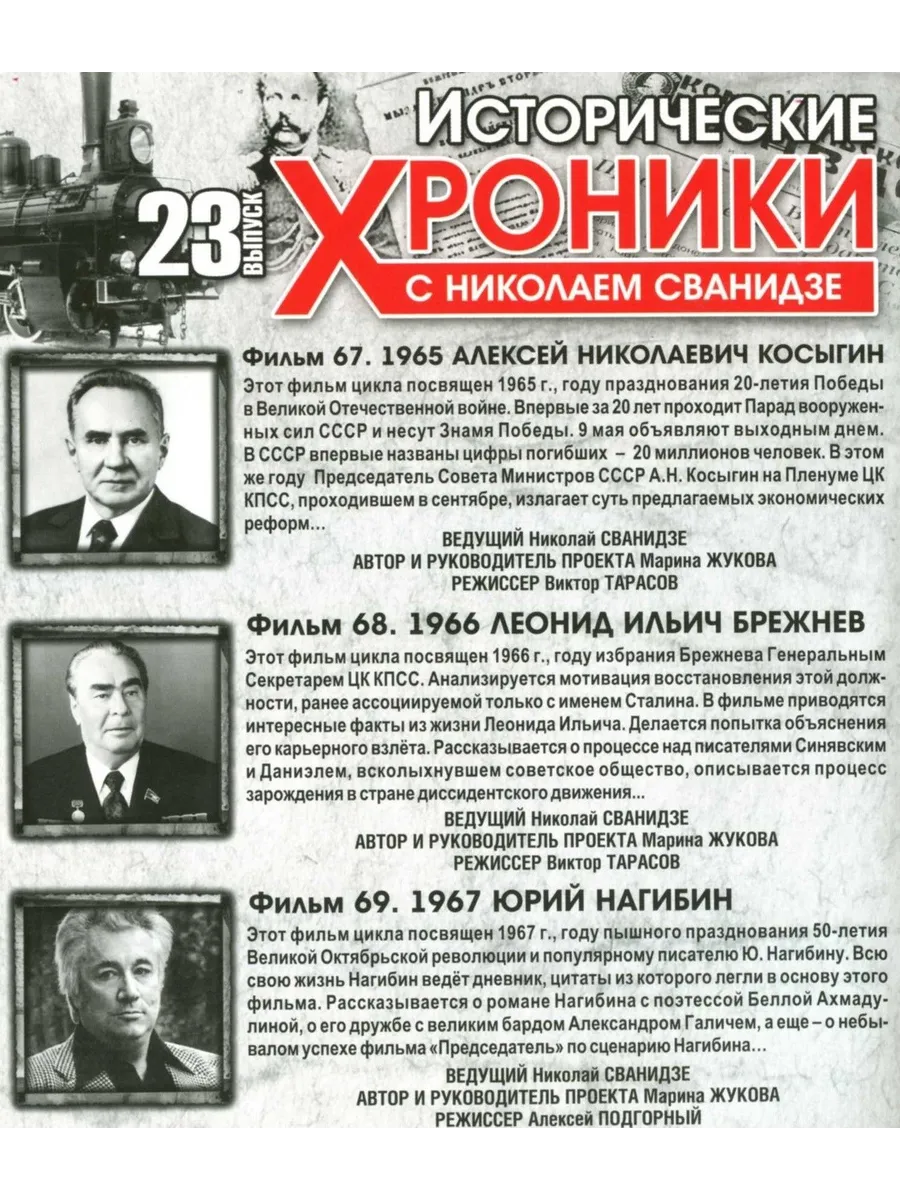 Фильм 67: 1965. Алексеи Николаевич КосыгинЭтот фильм цикла посвящен 1965 г., году празднования 20-летия Победы в Великой Отечественной войне. Впервые за 20 лет проходит Парад вооруженных сил СССР и несут Знамя Победы. 9 мая объявляют выходным днем. В СССР впервые названы цифры погибших - 20 миллионов человек. В этом же году Председатель Совета Министров СССР А.Н. Косыгин на Пленуме ЦК КПСС, проходившем в сентябре, излагает суть предлагаемых экономических реформ...
