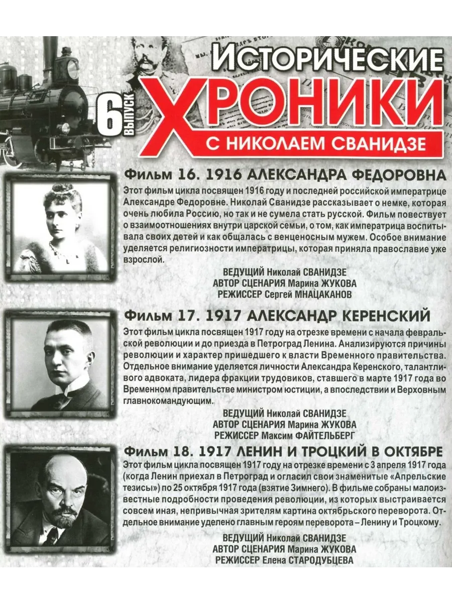 Фильм 16. 1916 - Александра ФедоровнаЭтот фильм цикла посвящен 1916 году и последней российской императрице Александре Федоровне. Николай Сванидзе рассказывает о немке, которая очень любила Россию, но так и не сумела стать русской. Фильм повествует о взаимоотношениях внутри царской семьи, о том, как императрица воспитывала своих детей и как общалась с венценосным мужем. Особое внимание уделяется религиозности императрицы, которая приняла православие уже взрослой.