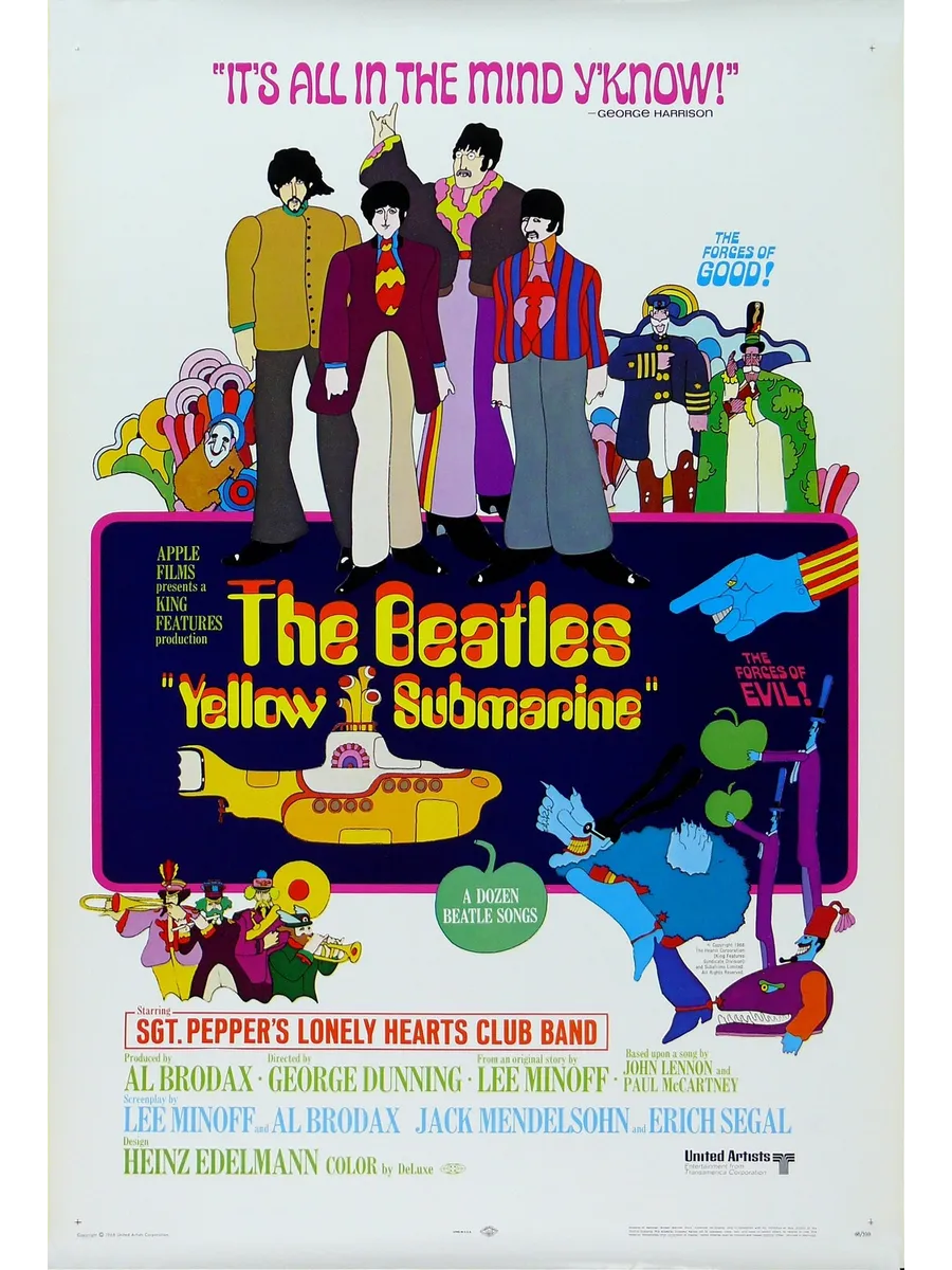 Знаменитая четверка Битлз поёт и совершает путешествие на желтой подводной лодке по фантастической стране Пепперлэнд, борясь за любовь, дружбу, цветы и музыку против злых и плохих уродцев — синих вреднючек.