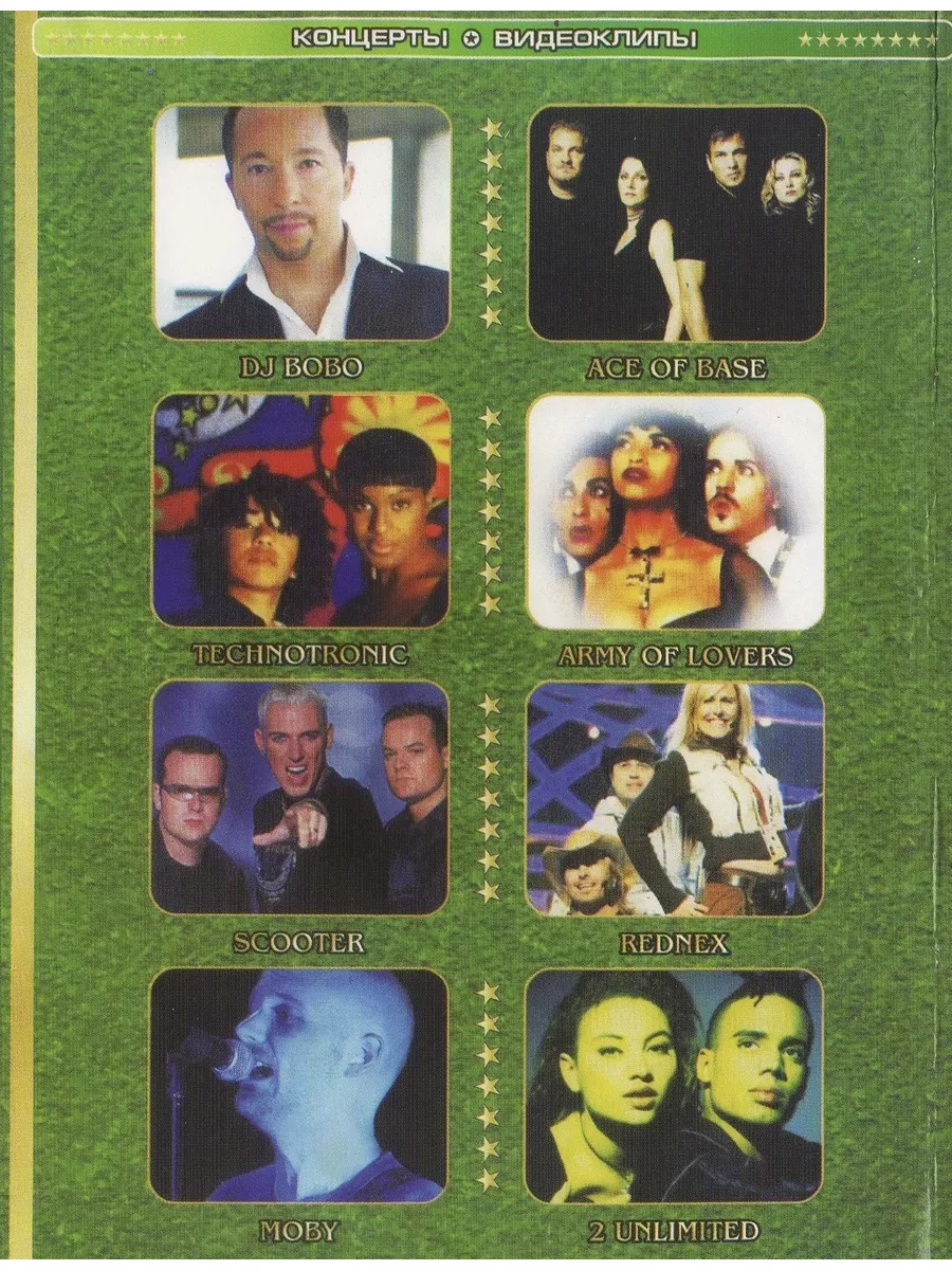 Звезды зарубежной эстрады 90-е годы: Dj Bobo, Technotronic, Scooter, Moby, Ace of Base, Army of Lovers, Rednex, 2 Unlimited (Клипы DVD). Особенность данного диска в том, что он может быть воспроизведен на любом DVD-плеере, домашнем кинотеатре или музыкальном центре, читающем DVD диски.