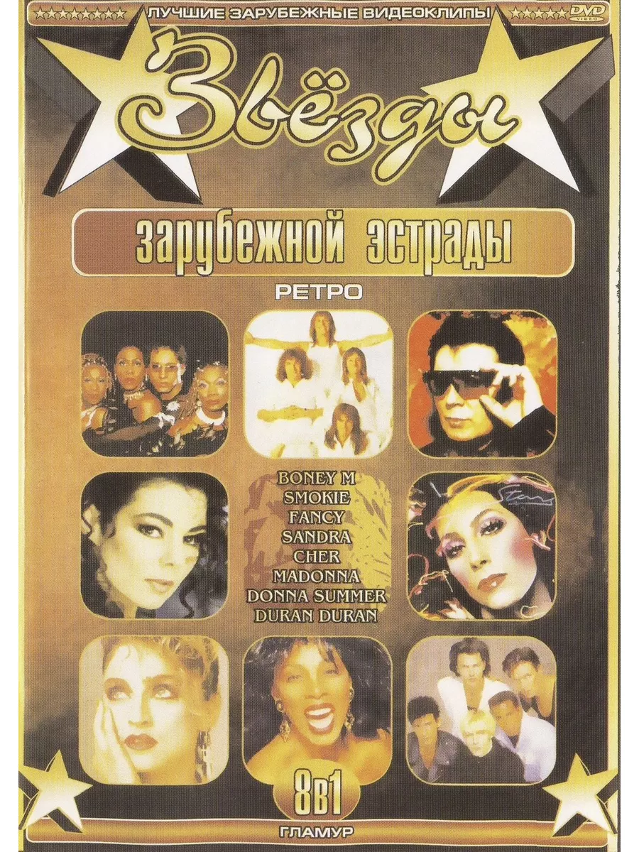 Звезды зарубежной эстрады Гламур: Boney M, Smokie, Fancy, Sandra, Cher, Madonna, Donna Summer, Duran Duran (Клипы DVD). Особенность данного диска в том, что он может быть воспроизведен на любом DVD-плеере, домашнем кинотеатре или музыкальном центре, читающем DVD диски.