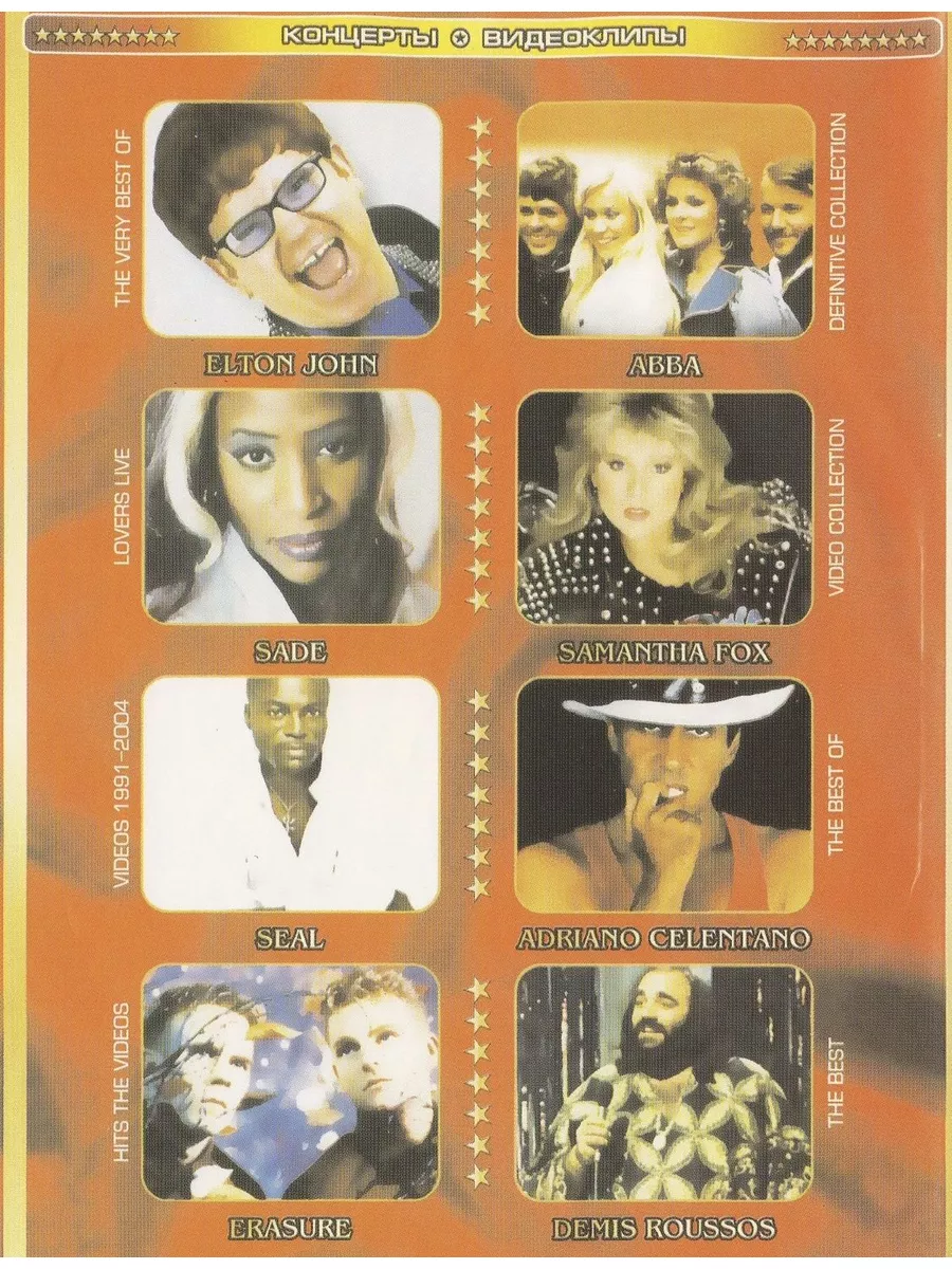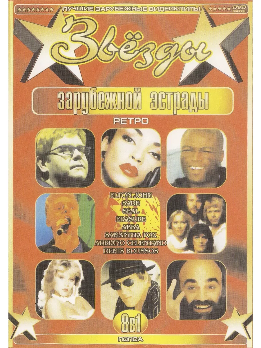 Звезды зарубежной эстрады Попса: Elton John, Sade, Seal, Erasure, Abba, Samanta Fox, Adriano Celentano, Demis Roussos (Клипы DVD). Особенность данного диска в том, что он может быть воспроизведен на любом DVD-плеере, домашнем кинотеатре или музыкальном центре, читающем DVD диски.